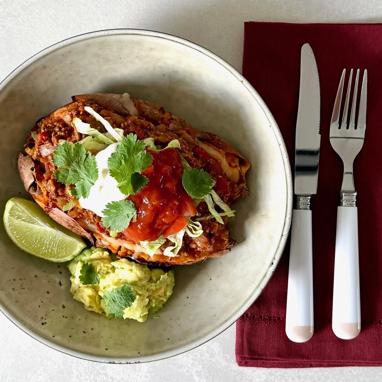 5. Assemble: Slice open each roasted sweet potato, lightly mash the centre, and spoon the chilli over top followed by sprinkle of cheese. Add smashed avocado, salsa, cheese, lettuce, and sour cream. Finish with a squeeze of lime.