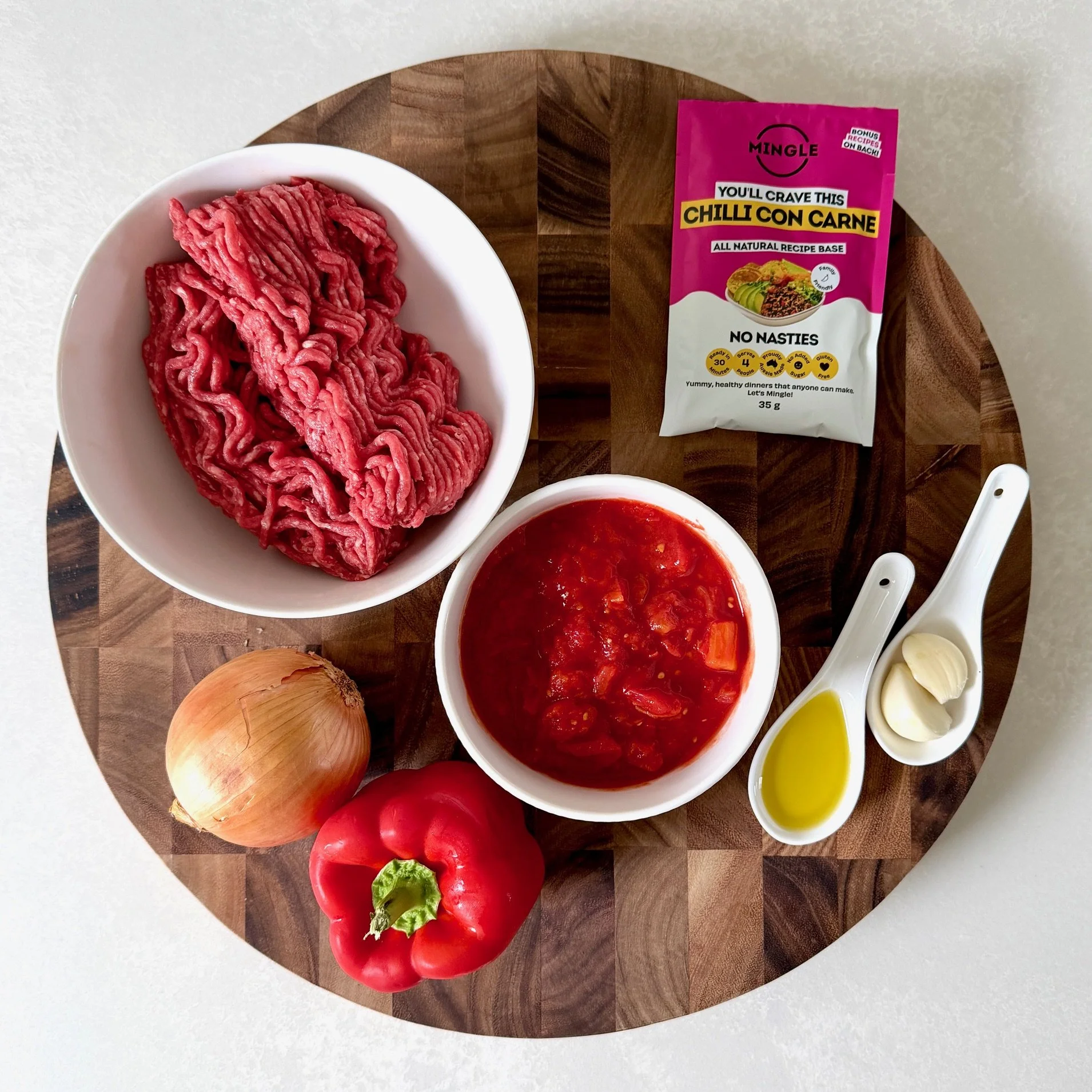 3. Add mince and spice: Stir in the beef mince, breaking it apart with a spoon until browned. Add diced capsicum, canned tomatoes, and the Mingle Chilli Con Carne seasoning. Simmer for 15-20 minutes, stirring occasionally until thickened.