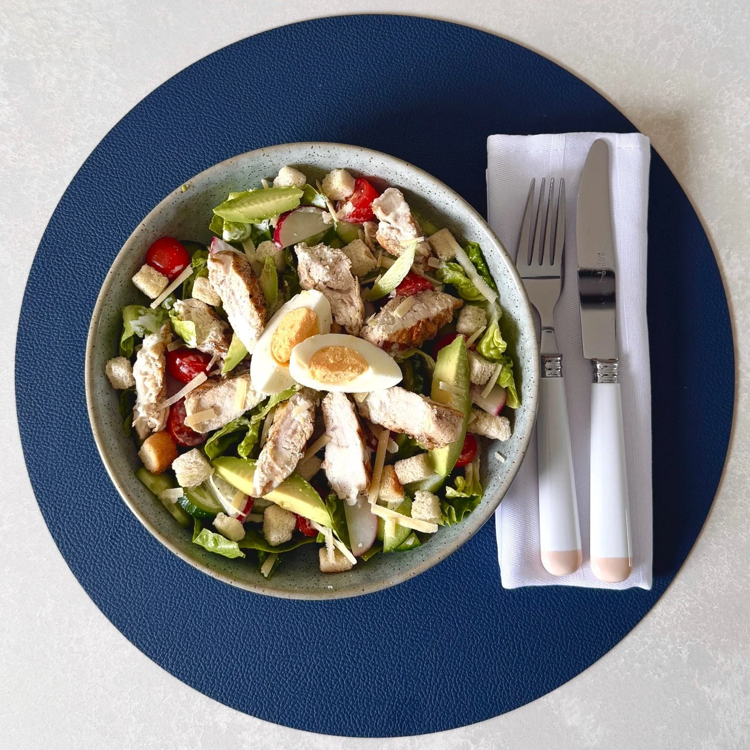 3. Assemble Salad: Layer baby cos lettuce, cucumber, cherry tomatoes, radish, and avocado. Add croutons and shaved parmesan, and top with warm grilled chicken. Drizzle with 2½-3 tbsp dressing per serve, or serve dressing on the side.