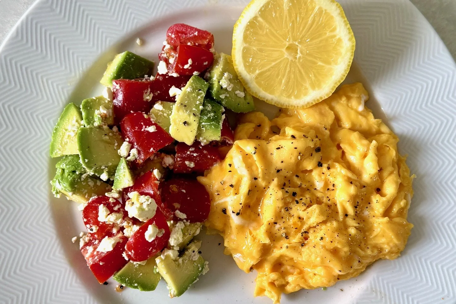 Soft Scrambled Eggs with Avocado, Feta & Tomato Salad